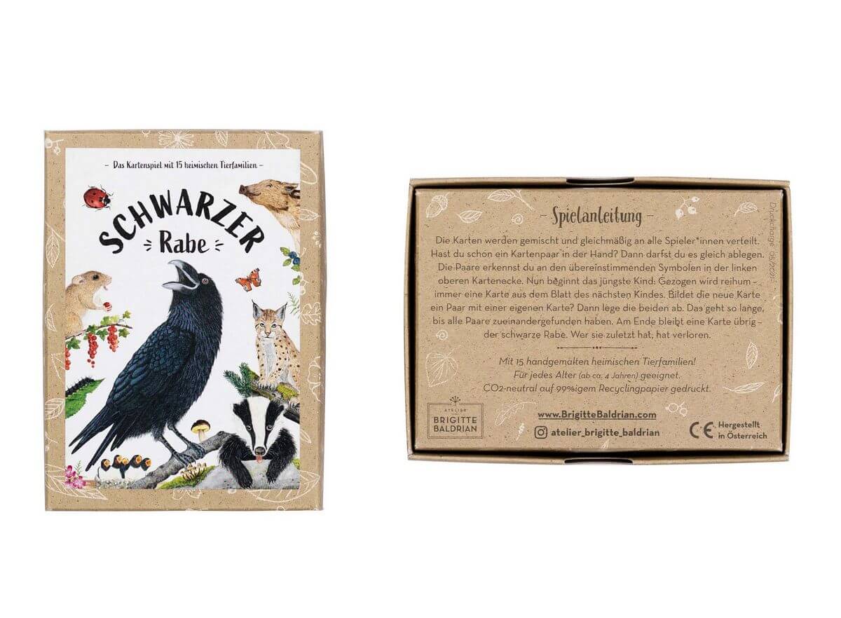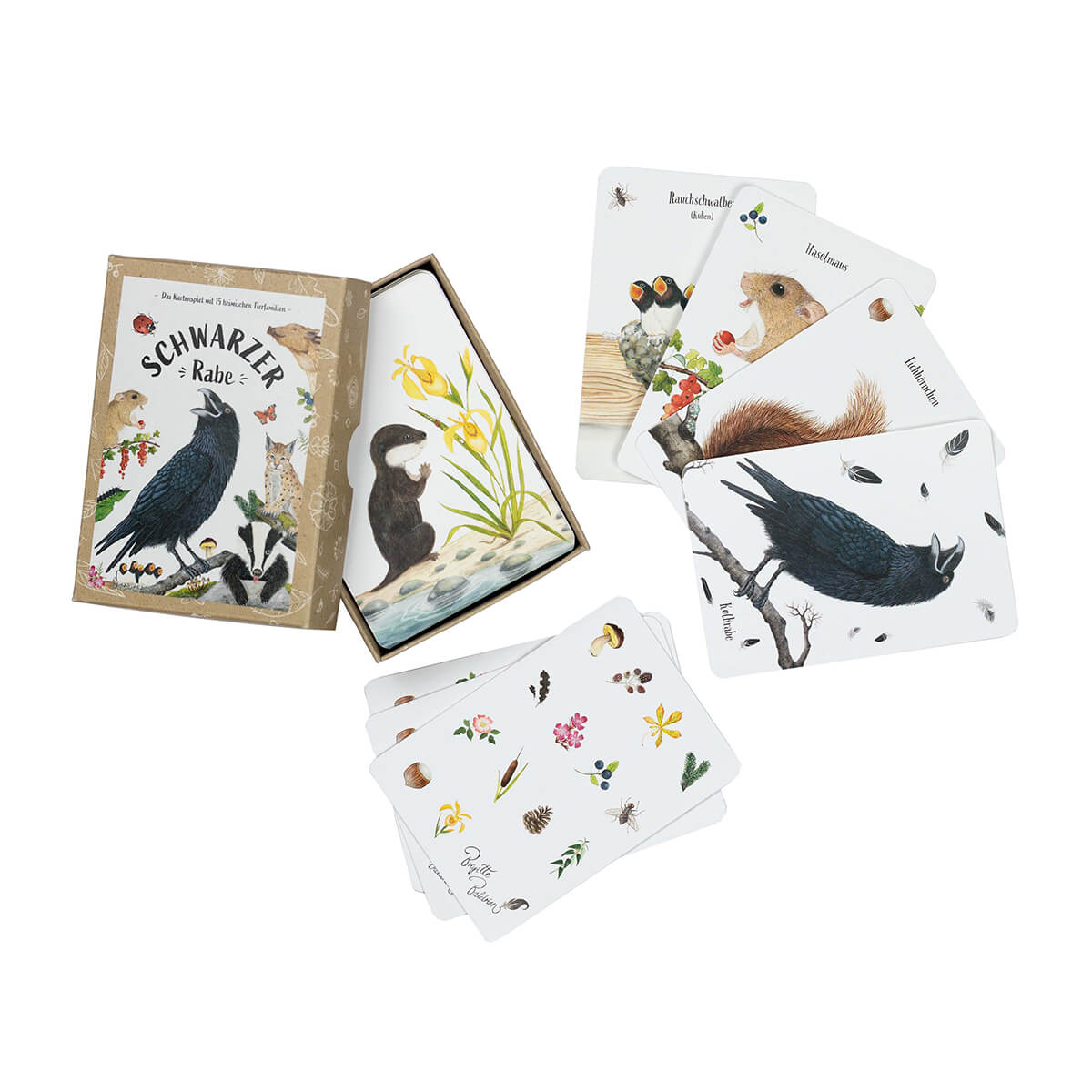 Hier tummeln sich Fischotter, Haselmaus, Buntspecht, Eichhörnchen – aber auch Insekten, Amphibien und Reptilien finden sich in deinem Blatt. Die Paare bestehen jeweils aus Jung- und Elterntier und sind mit Artnamen beschriftet. So kannst du spielerisch allerhand über unsere Natur lernen. Wer hat den schwarzen Raben gezogen? Ein kurzweiliges Kartenspiel für jedes Alter (ab etwa 3-4 Jahren).