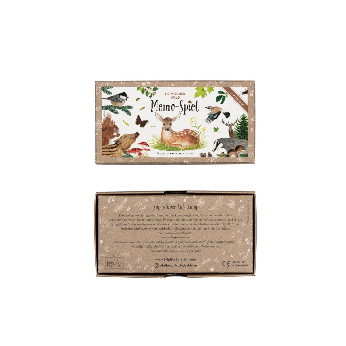 24 handgemalte und beschriftete Kartenpaare (Vorderseite und Rückseite bedruckt). Graspapierverpackung mit zarten Illustrationen.